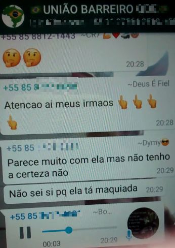 Em seguida, uma nova foto da garota é divulgada no grupo, desta vez ela está chorando. Os participantes debocham do choro da menina. "Alguma coisa tem, se ela já está com medo chorando", diz um dos criminosos. Ainda na conversa, o homem que mantém a menina refém, diz que encontrou no celular dela várias fotos e imagens que mostram que ela tem envolvimento com uma facção criminosa rival.